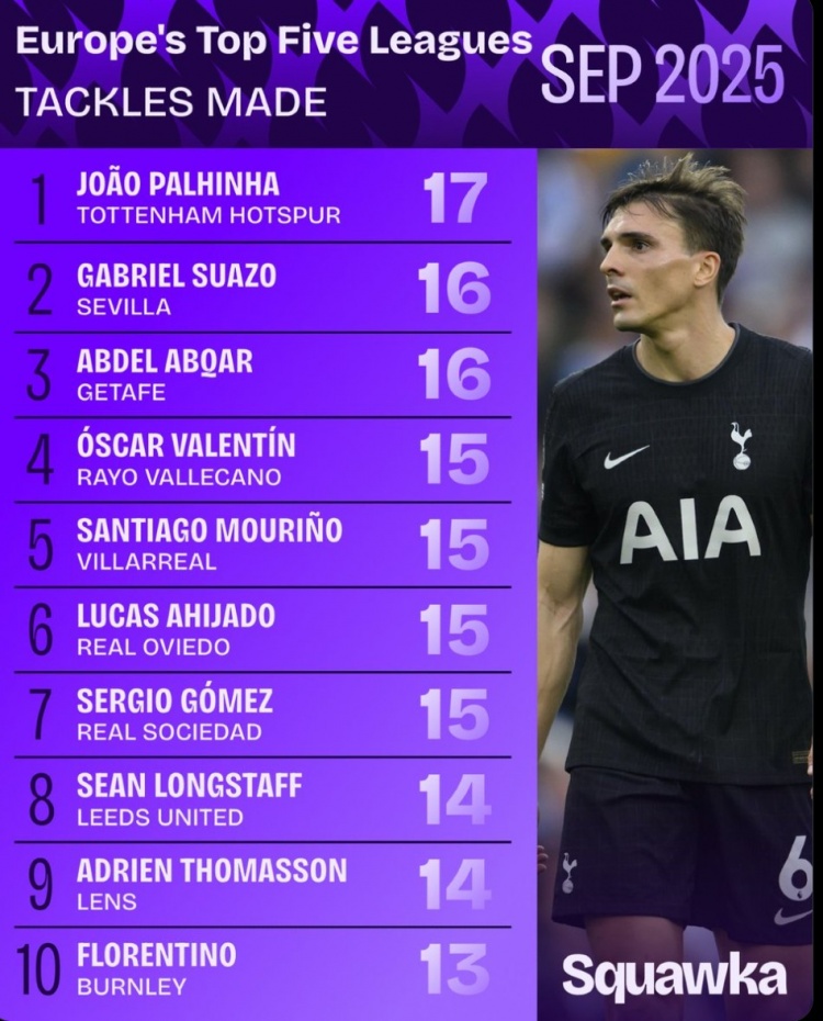 10月1日讯 今天,数据机构Squawka在社媒公布了九月份铲球榜,热刺中场帕利尼亚以17次得手铲球位居榜首。