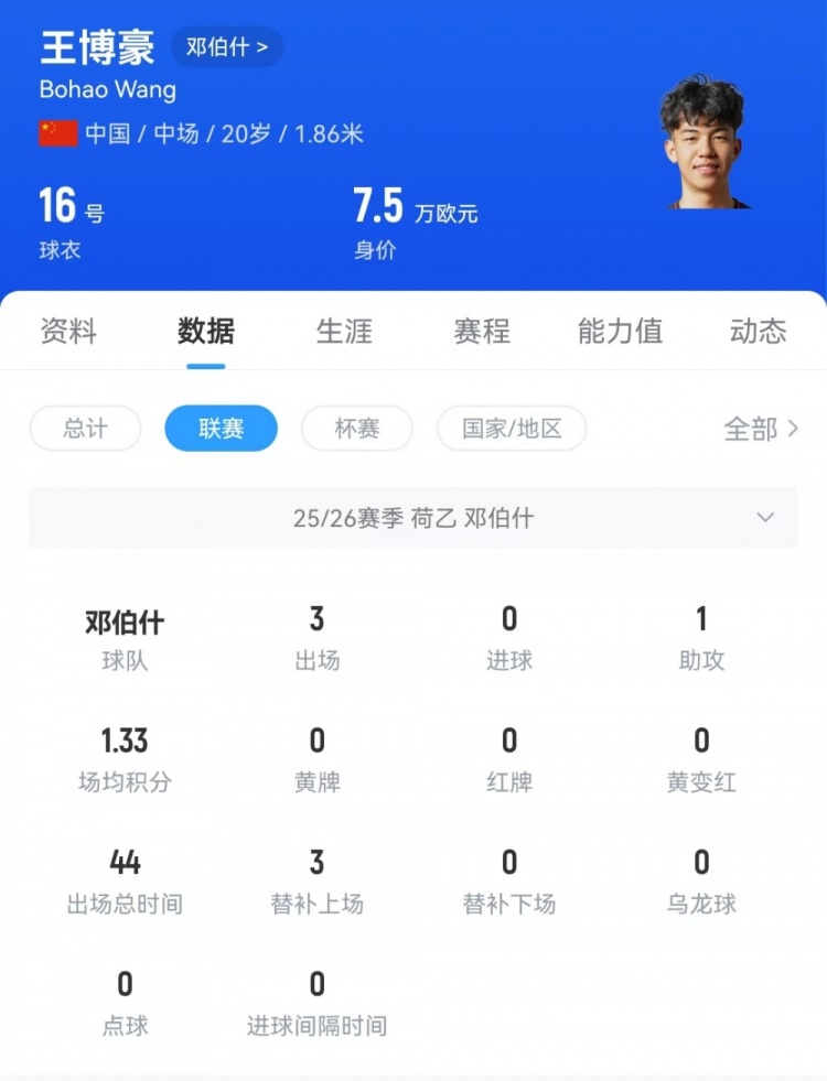 王博豪降生于2005年7月,本年20岁,身高1米86,踢中场位置。本赛季从陕西鸠合租出到荷乙球队邓伯什,出场3次,均是替补出场,送出1次助攻。