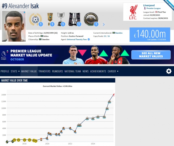 10月17日讯 德国转会市集今天更新了英超球员的身价,利物浦今夏创记录引进的时尚伊萨克从1.2亿欧涨至1.4亿欧,德转解决员显露了这次飞腾的原因。