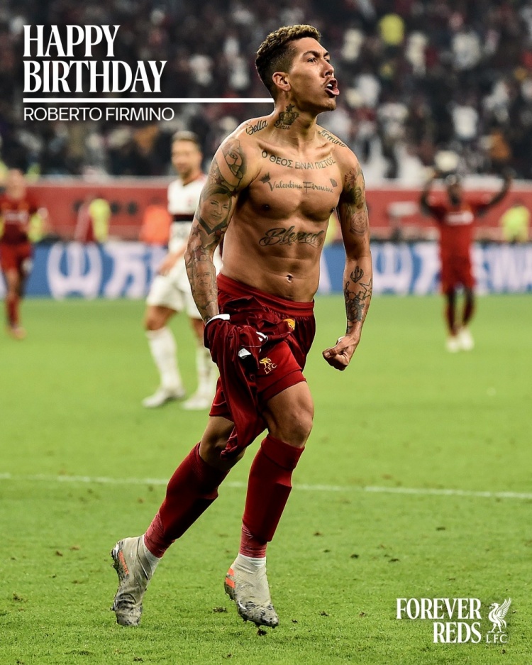 利物浦官方社媒晒出为菲尔米诺制作的诞辰海报,配文:“祝你渡过好意思好的一天,菲尔米诺。”