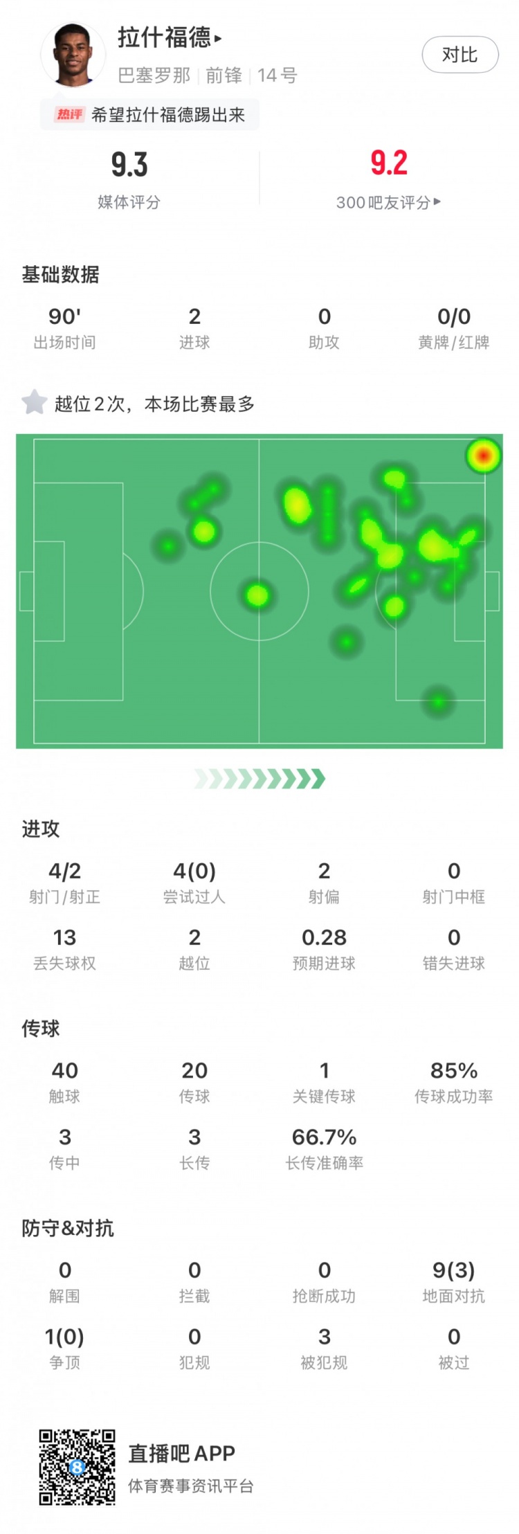 拉什福德数据:4次射门2进球,预期进球0.28,1缺欠传球,评分9.3