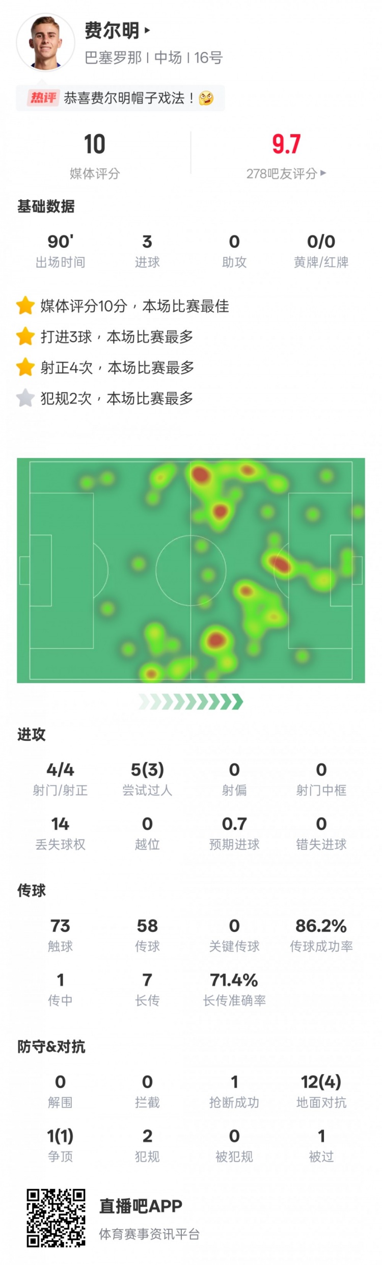 费尔明本场数据:4射4正戴帽+3过东说念见地效,评分10.0全场最高