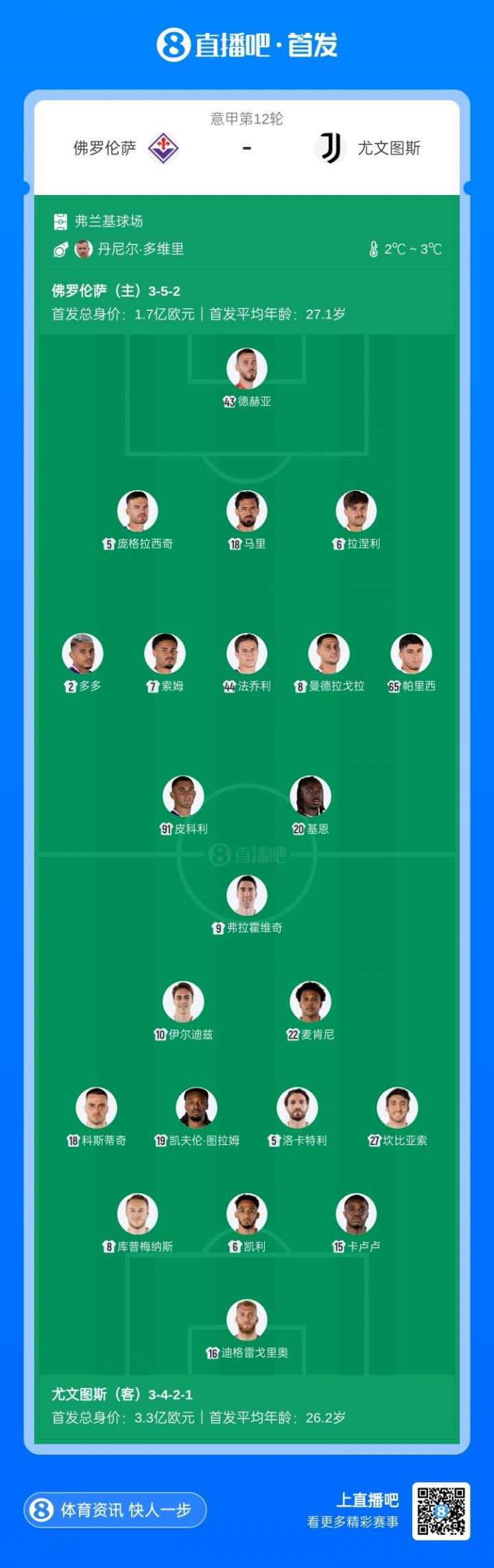 11月23日讯 意甲第12轮,佛罗伦萨主场迎战尤文比赛行将打响。赛前首发出炉。