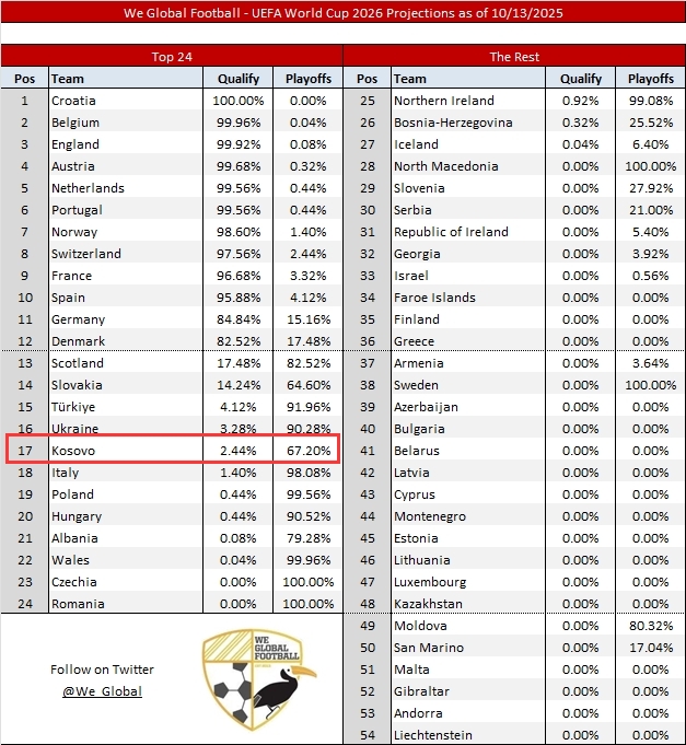 据We Global Football展望,科索沃小组第一纵贯天下杯的概率仅2.44%,但插足欧洲区附加赛的概率高达67.2%。