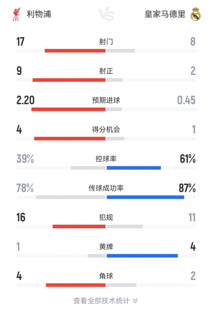 利物浦1-0皇马全场数据:赤军4成控球17射9正,皇马6成控球8射2正