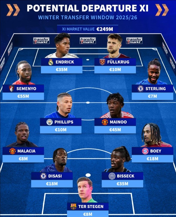 先锋:塞梅尼奥(伯恩茅斯)5500万欧、恩德里克(皇马)3500万欧、菲尔克鲁格(西汉姆联)1000万欧、斯特林(切尔西)700万欧