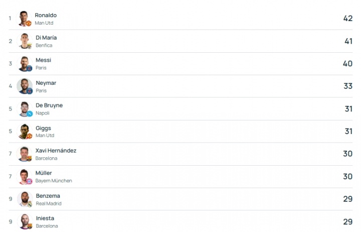 德布劳内刻下欧冠助攻31记,与吉格斯并排第五,C罗、迪马利亚、梅西前三。