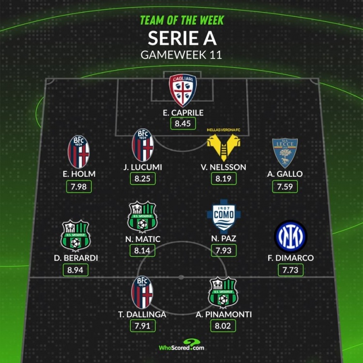 中场:贝拉尔迪(萨索洛,8.94分)、马蒂奇(萨索洛,8.14分)、帕斯(科莫,7.93分)、迪马尔科(国外米兰,7.73分)