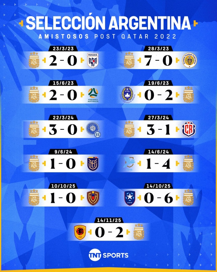 据TNT统计,2022年卡塔尔寰宇杯之后,阿根廷队进入11场友谊赛,一谈取胜。