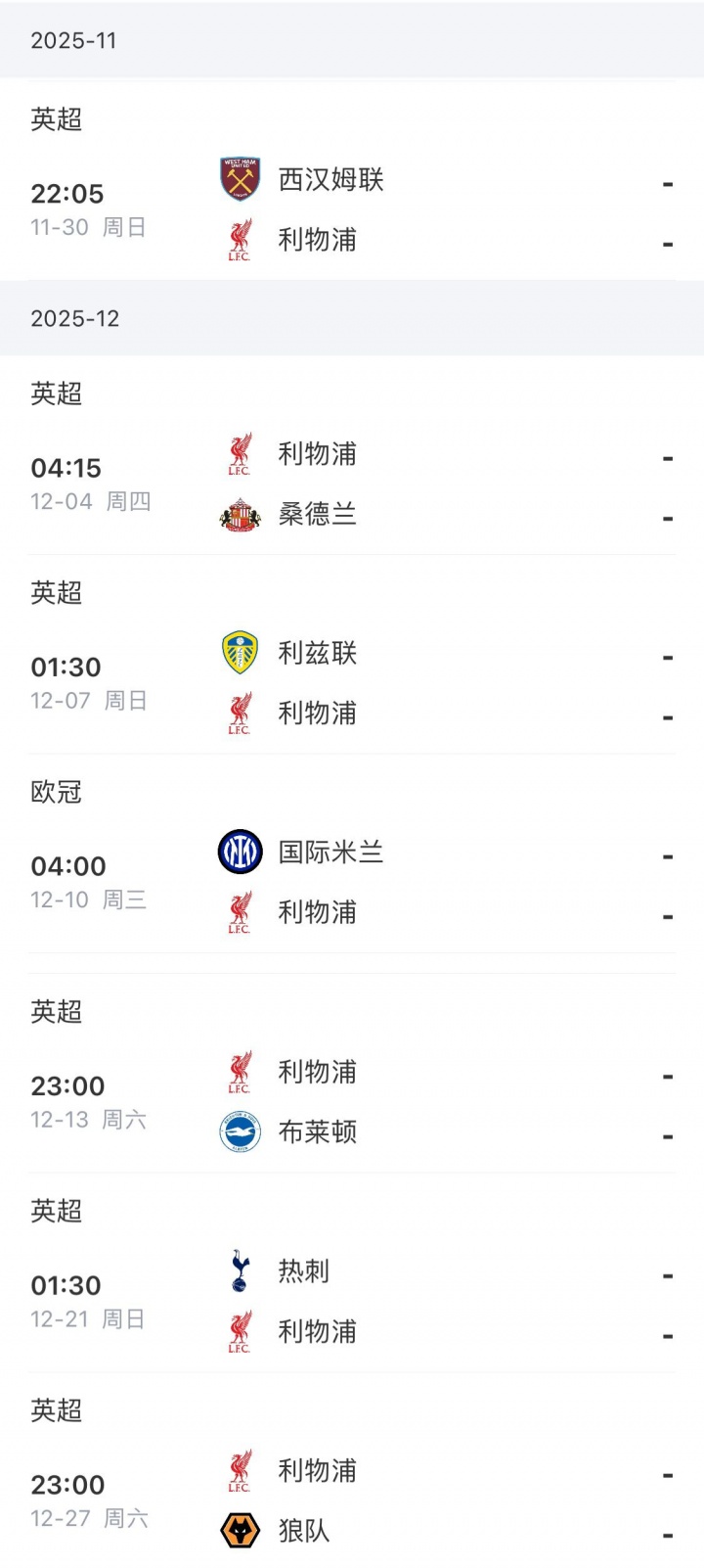 利物浦将来赛程密集,英超将对阵西汉姆、桑德兰、利兹联,欧冠下一轮的敌手是国米。