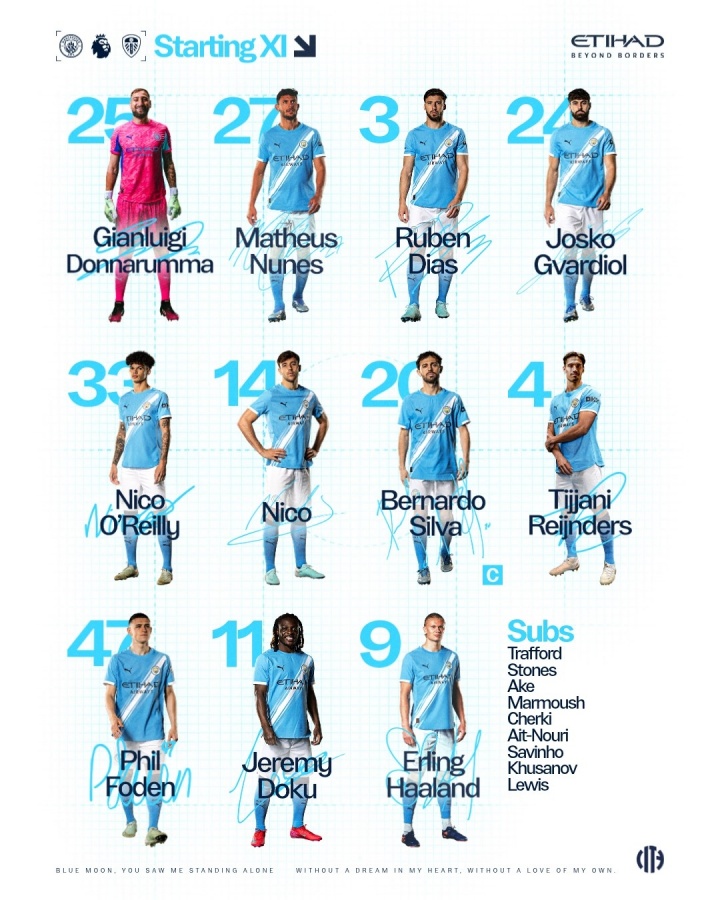 曼城vs利兹联首发:哈兰德、多库先发,赖因德斯、福登、B席出战