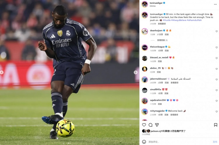 伤愈复出,吕迪格社媒晒照:感恩大约重返赛场,但平局难言知足