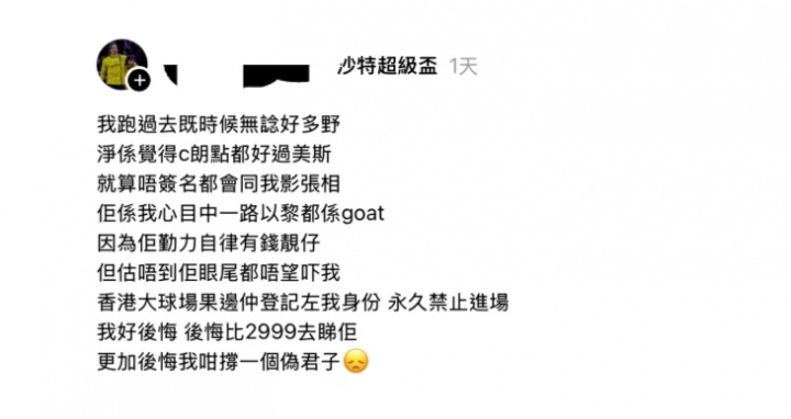 该球迷暗示:跑曩昔的时期没念念太多,以为C罗好过梅西。就算不签名也会和我合影。他一直是我心目中的goat,因为贫寒自律有钱还长得帅,但没念念到一眼皆没看我,中国香港大球场登记了我的身份,永远退却入场。我好后悔,后悔花2999去看球,愈加后悔我撑握一个假道学。