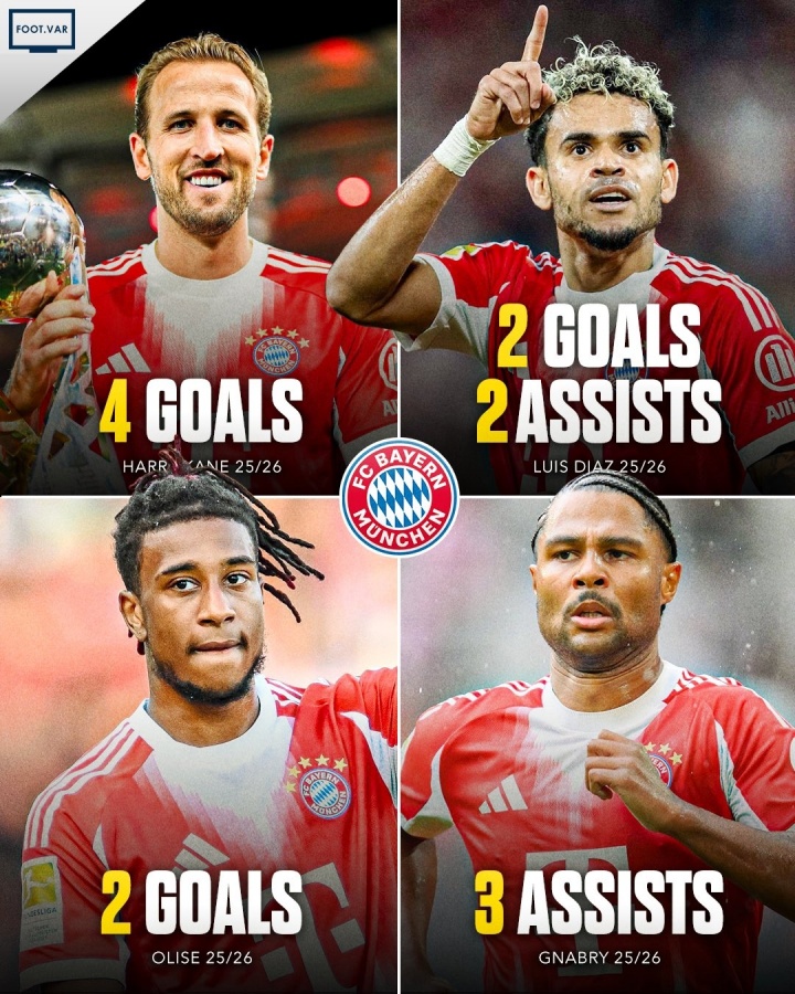 拜仁豪恣4东谈主组!凯恩2场4球 迪亚斯2球2助 奥利塞2球 格纳布里3助