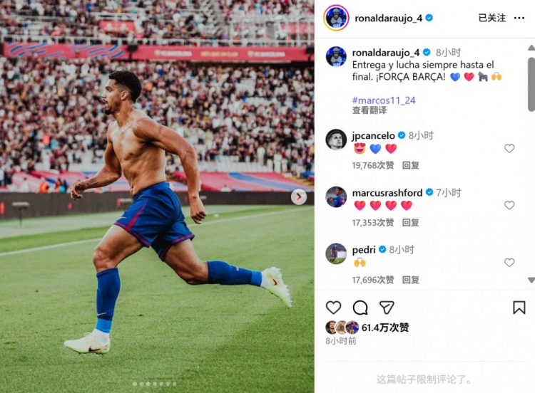 赛后阿劳霍也在社媒晒出进球后脱衣庆祝的像片,配文写说念:“始终拼尽全力并坚抓到临了一刻,加油巴萨!”