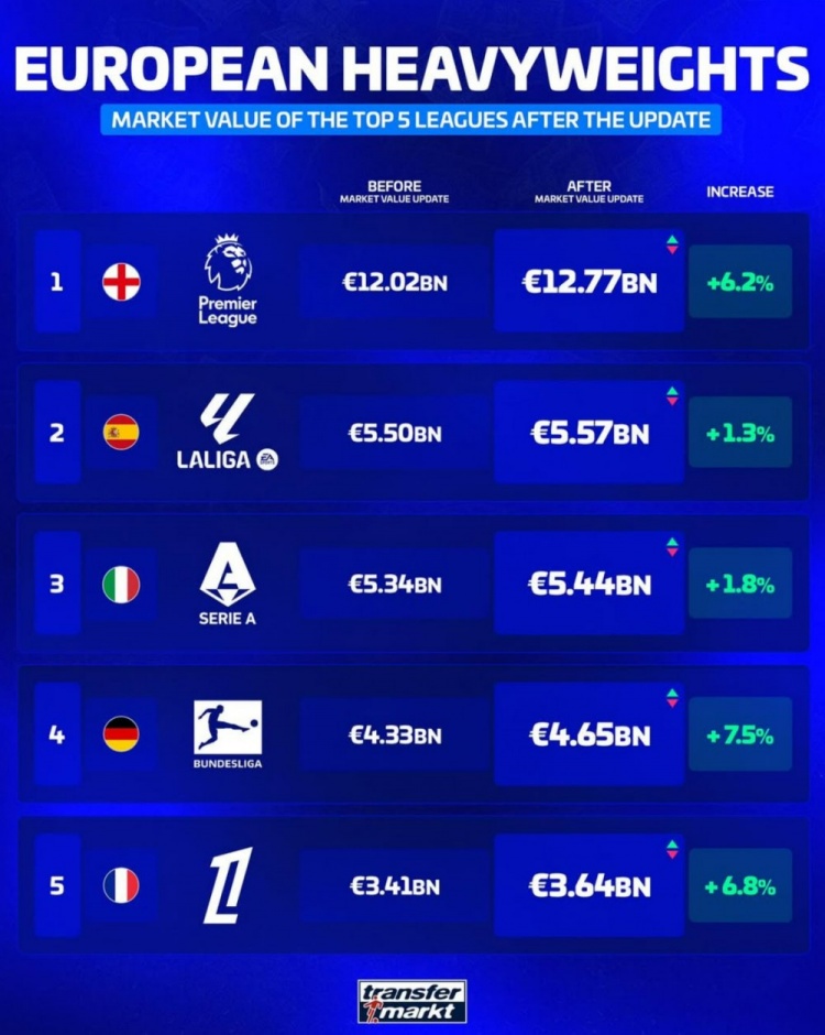 五大联赛球队总身价榜:英超遥遥跳动,西甲次席,意甲第三