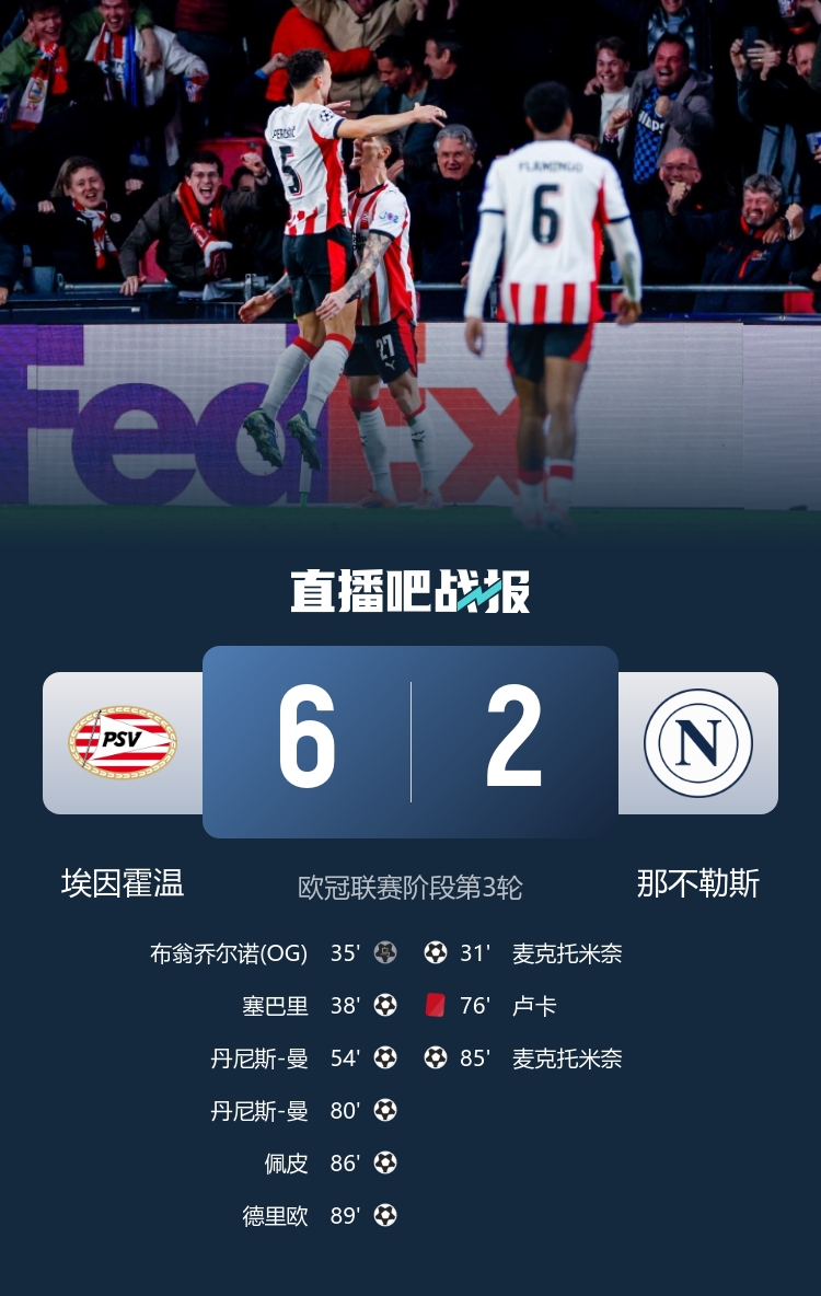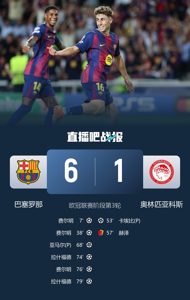 欧冠第3轮第一比赛日9场比赛一起限制,这9场比赛一共轰进43球(场均4.8球),其中有三支球队单场轰出6+进球(巴萨6-1奥林匹亚科斯、巴黎7-2勒沃库森、埃因霍温6-2那不勒斯)。