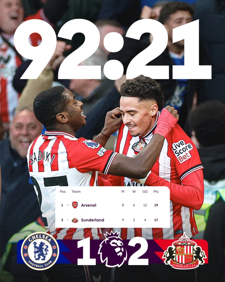10月26日讯 英超第9轮,桑德兰2-1打败切尔西,英超5胜2平2负,暂居积分榜第2。