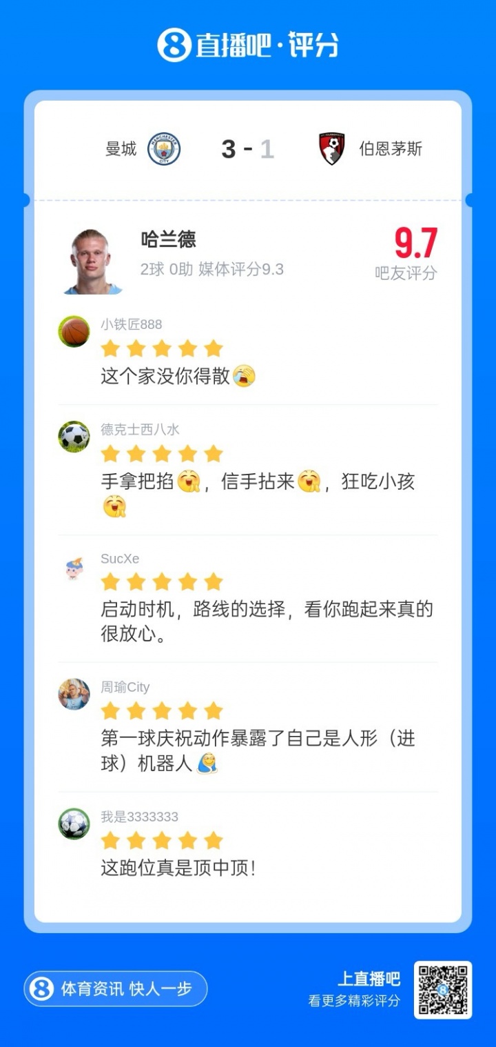 曼城时尚哈兰德梅开二度,匡助曼城3-1校服伯恩茅斯升至第二。哈兰德得回吧友超7万的投票,当选【X咪咕体育英超第10轮最好球员】!