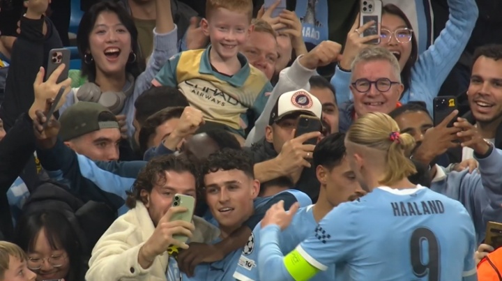 11月06日讯 欧冠联赛阶段第4轮曼城vs多特第22分钟,福登进球后跑到角旗区庆祝,有球迷搂着他自拍了一张,福登还看镜头笑的十分合作。