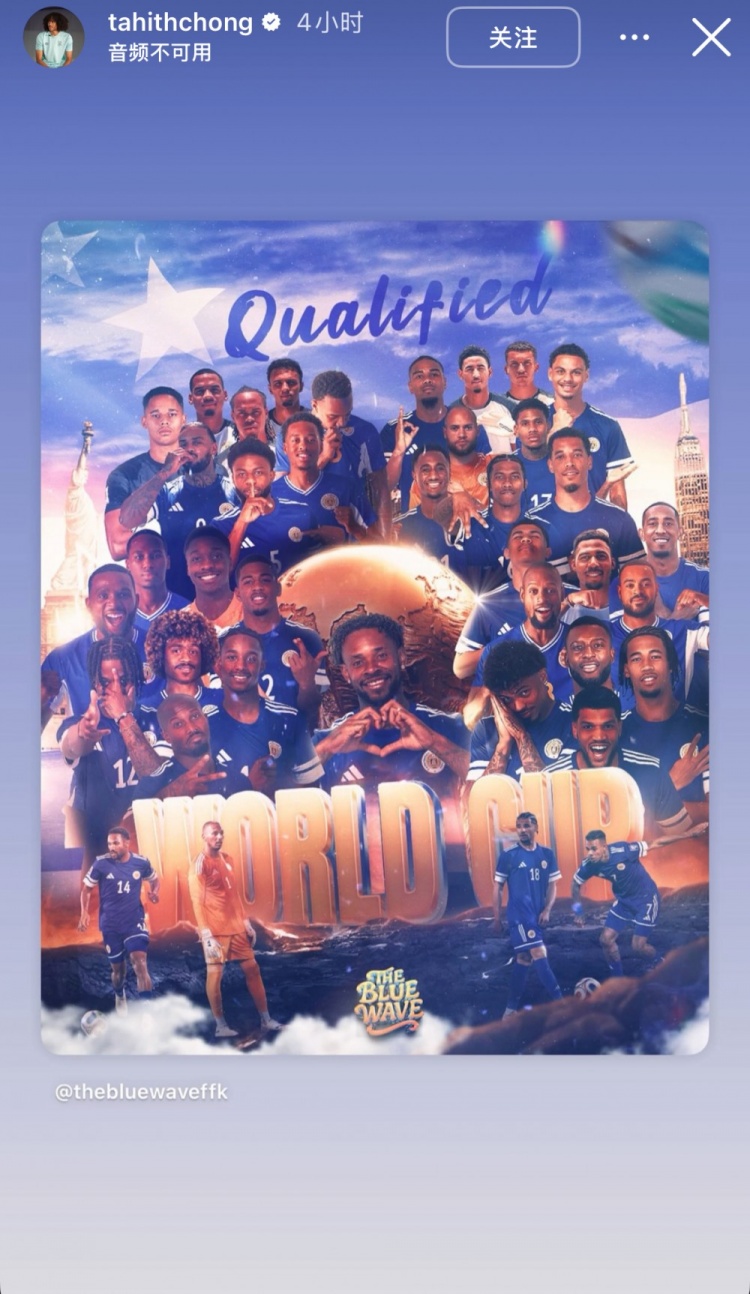 25岁华侨球员陈达毅(旧译为钟塔西)在比赛扬弃后更新社媒,晒出了库拉索晋级寰宇杯的庆祝海报。